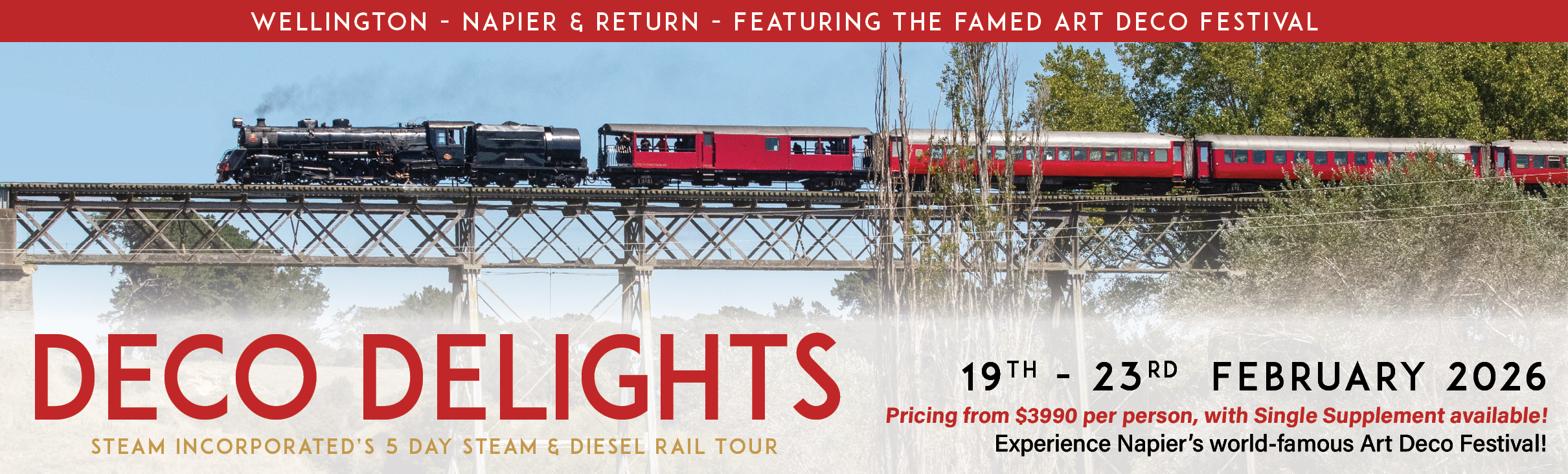We would like to welcome you onboard ‘Deco Delights,’ a 5 day getaway to the east of the North Island, the beautiful Hawkes Bay, and an in depth look at Napier’s Art Deco Festival. For 5 days, let us take the stress out of your travel, with our tour guide team who are available at any hour to take care of any thing that is not to your satisfaction. Our aim is to redefine your heritage rail experience, and create a life time of memories that you can look back on!