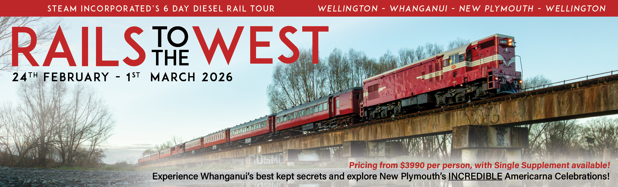 We would like to welcome you onboard ‘Rails to the West’. A 6 day getaway focusing on a pair of main centres up the North Island’s West Coast - Whanganui & New Plymouth, and on AMERICARNA - New Plymouth's annual gathering of American muscle! For 6 days, let us take the stress out of your travel, with our tour guide team who are available at any hour to take care of any thing that is not to your satisfaction. Our aim is to redefine your heritage rail experience, and create a life time of memories that you can look back on!