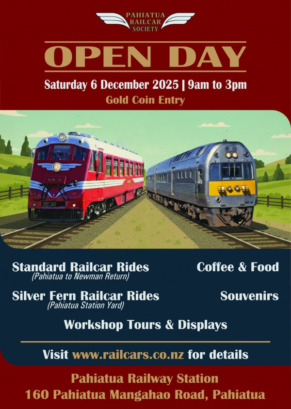Available for purchase on the day, is a trip on the Railcar Rambler - a scenic return trip on the seldom used Wairarapa Line from Pahiatua to Newman aboard our 1938 Standard Railcar RM31. Return fares for this offering is Adult $35 | Child $ 25 | Family $100 (2A 2C), and can be booked on the day.
