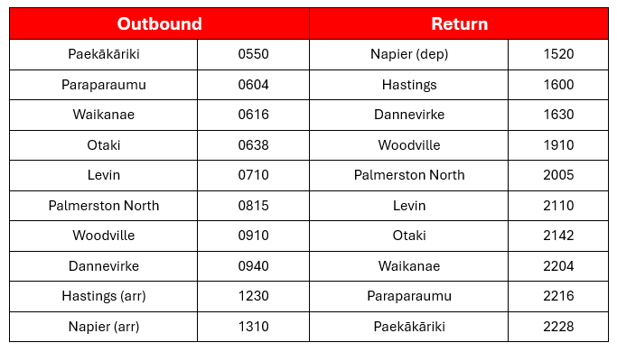 Departing Palmerston North/Woodville/Dannevirke