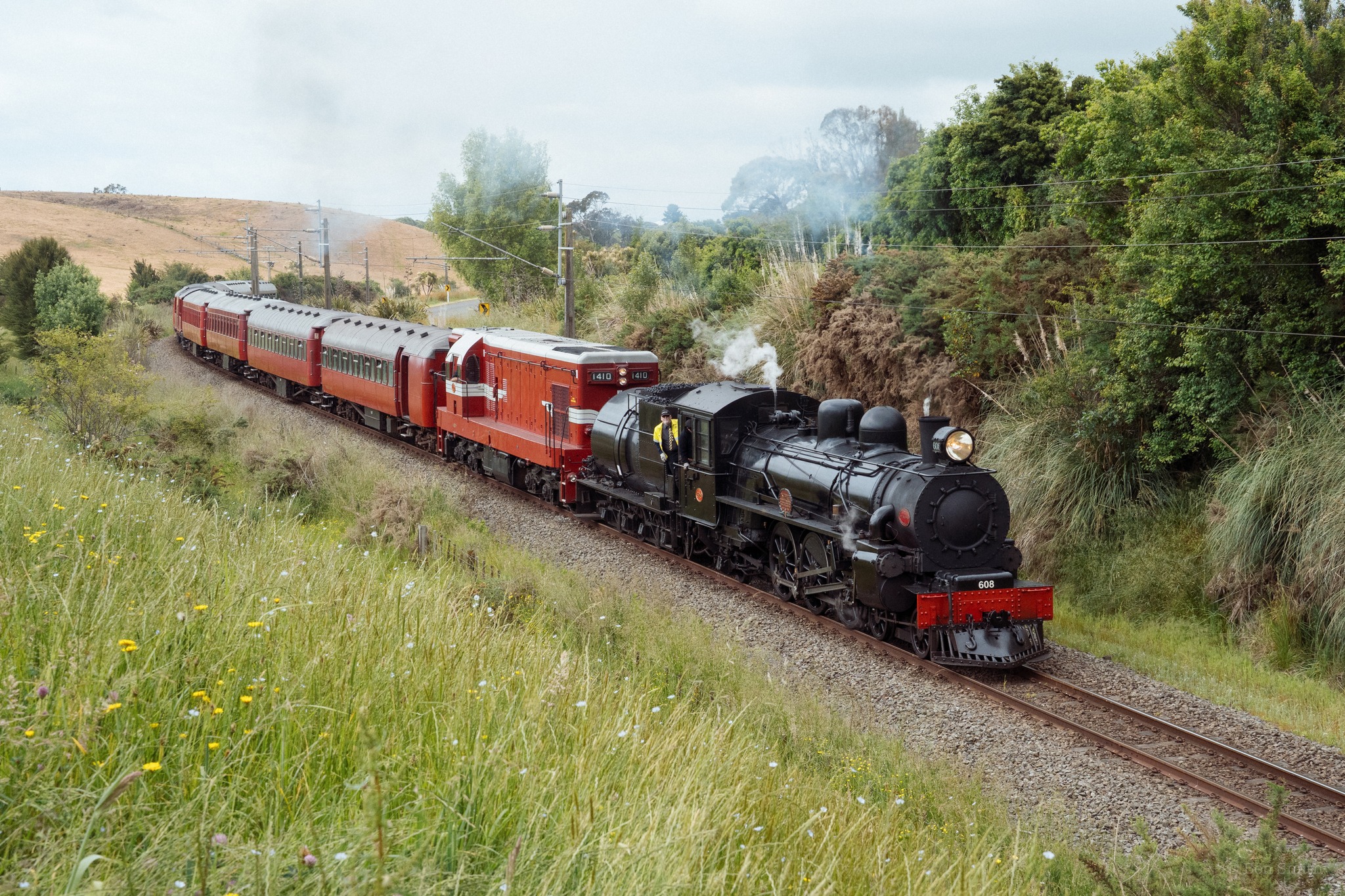 Travel to the beautiful river side town of Whanganui, hauled by both steam locomotive Ab 608 and heritage diesel electric locomotive, Da 1410. Choose between doing your own thing, or jumping on a serene cruise of the Whanganui River onboard the coal fired paddle steamer "PS Waimarie".