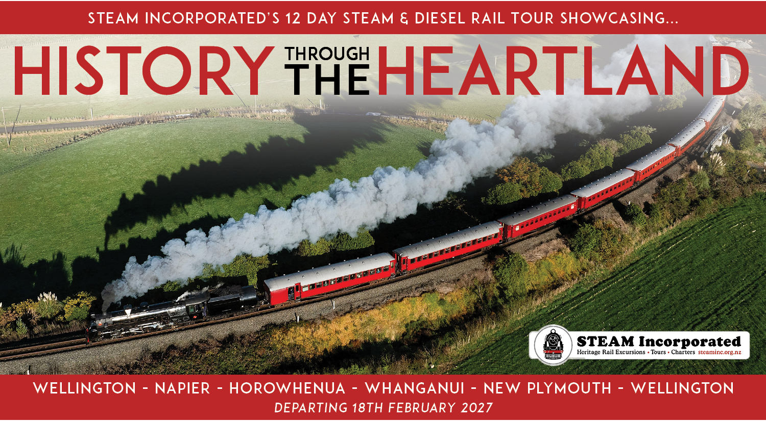 We would like to warmly invite you onboard our first multi-day rail tour in many years, exploring “History through the Heartland”. An 12 day rail experience focusing on different historical influences through the North Island’s central heart, with our steam & diesel hauled heritage trains linking your journey together - on a journey into the shaping of a nation.